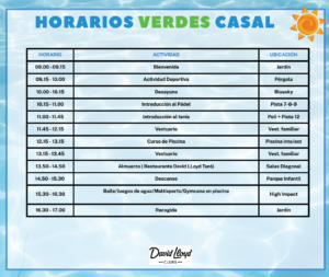Ce casal, est une expérience amusante et dynamique à travers le sport. Les élèves seront initiés au tennis et au padel avec des instructeurs qualifiés. Ils pratiqueront des activités aquatiques en fonction de leur âge.